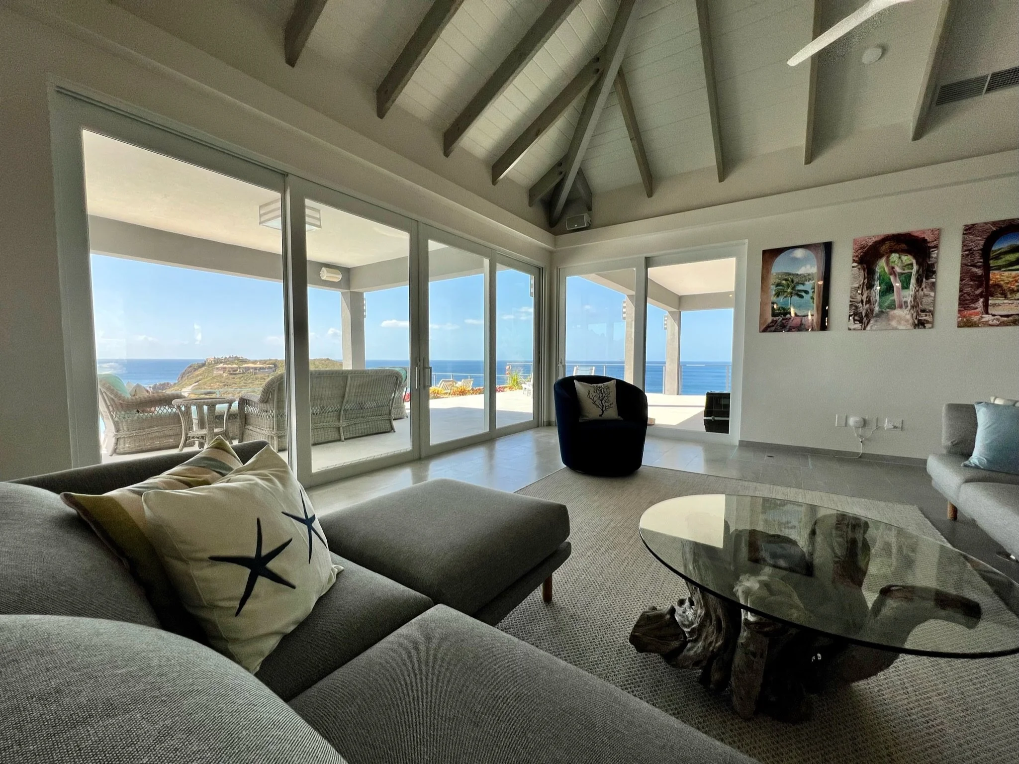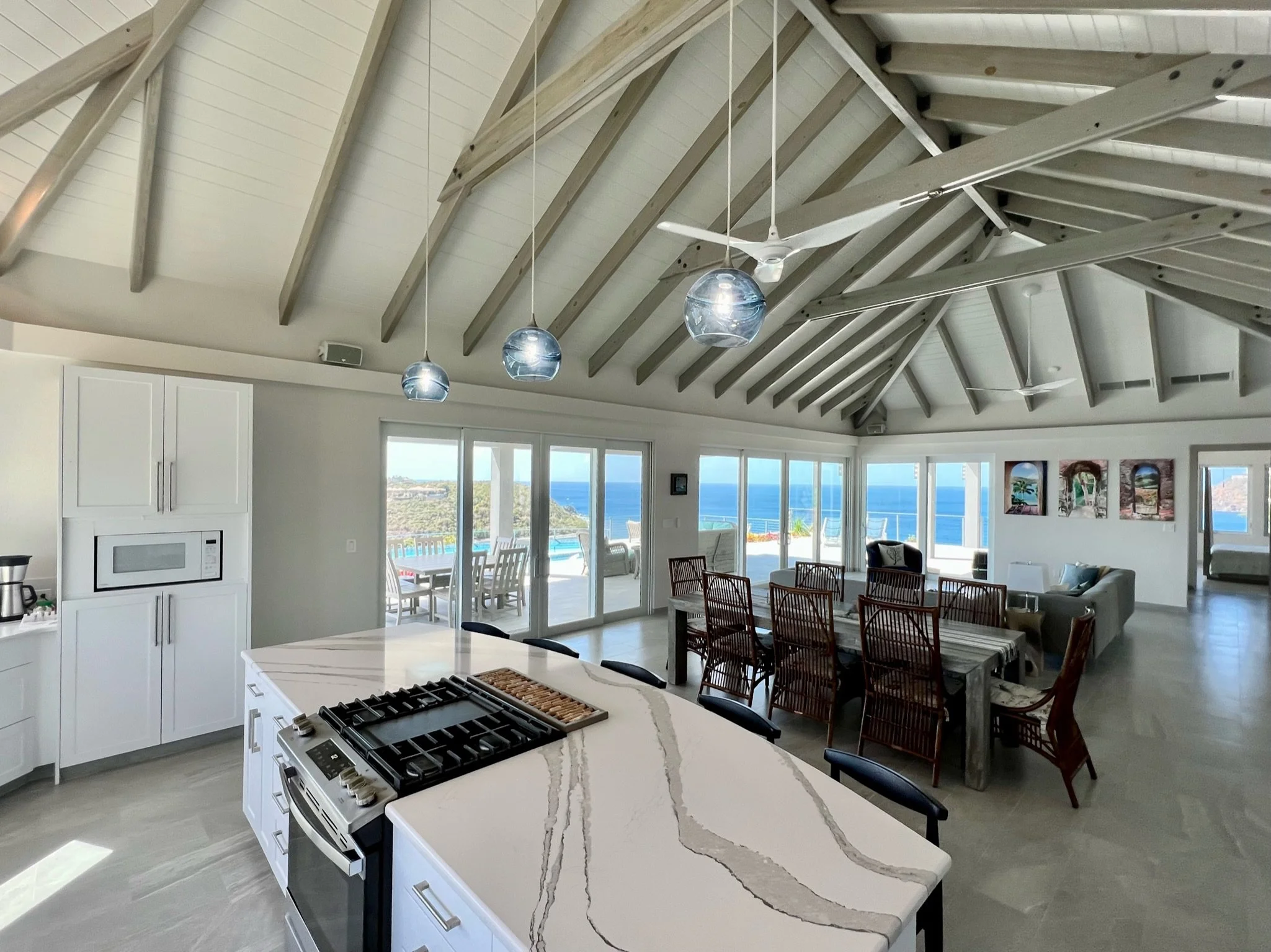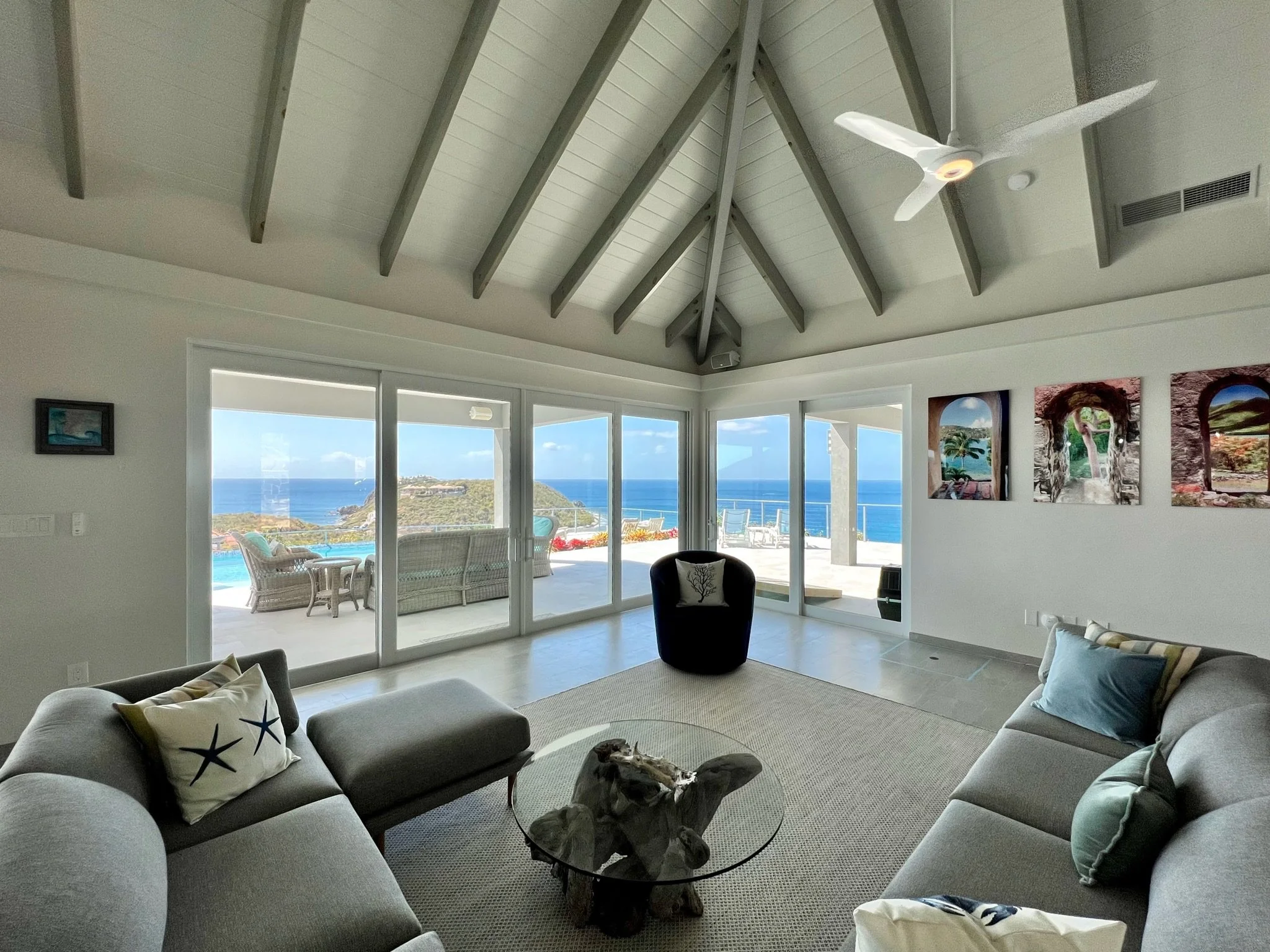 An expansive tiled deck with shady seating and comfortable sunning areas surrounds the large, heated infinity pool. Patio games await you at sunset while the rich and famous sit in yachts, yearning for the stunning perch over their anchorage. Inside, the simple elegance of the great room, with driftwood gray undertones and a glorious, softly lit vaulted ceiling invite in the 1000 shades of blues from the ocean and sky, sparkling through the sliding glass walls and windows. The chef’s kitchen is an oversized masterpiece, with white stone and panoramic views hanging over a turquoise bay, where waves crash into the stone shore below. Sonos speakers help spread the vibe throughout the property, from the in-pool lounging to the Zen horseshoe and hammock “beach” out back.