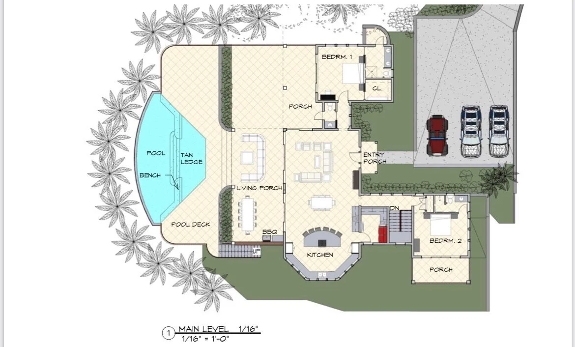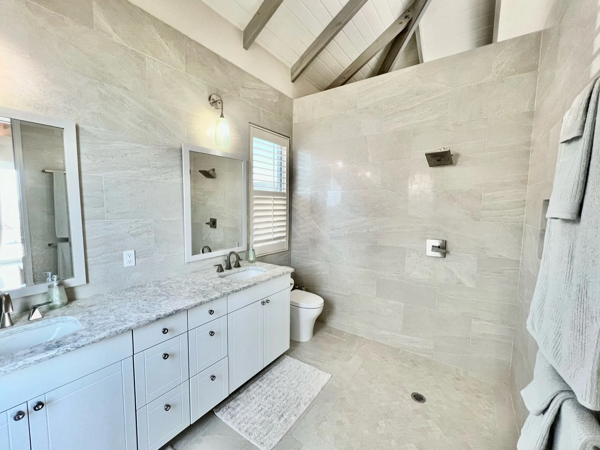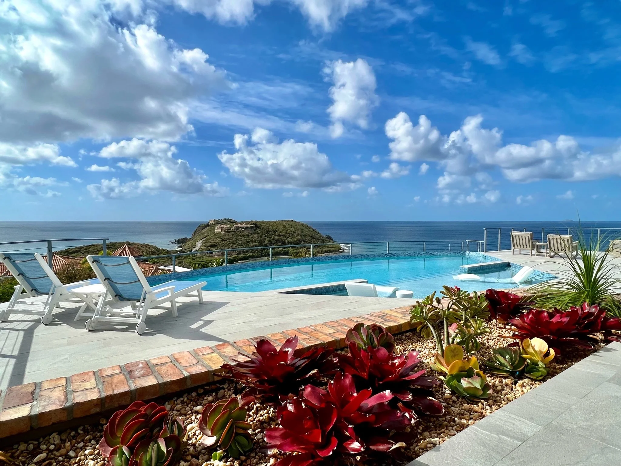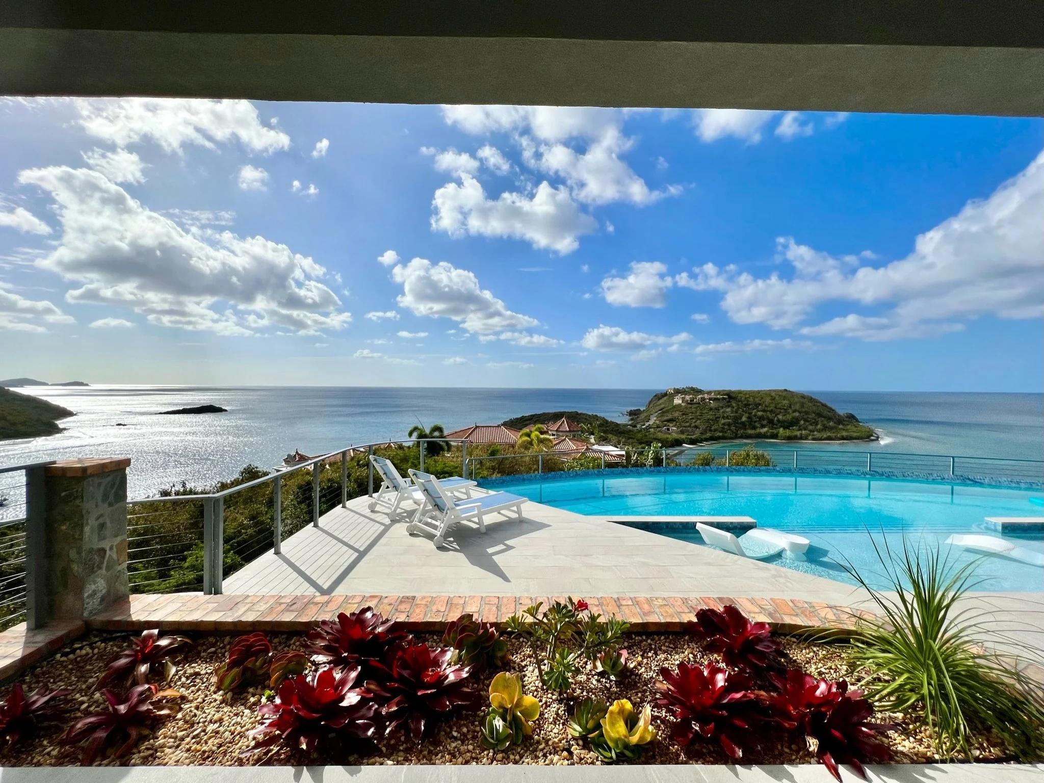 An expansive tiled deck with shady seating and comfortable sunning areas surrounds the large, heated infinity pool. Patio games await you at sunset while the rich and famous sit in yachts, yearning for the stunning perch over their anchorage. Inside, the simple elegance of the great room, with driftwood gray undertones and a glorious, softly lit vaulted ceiling invite in the 1000 shades of blues from the ocean and sky, sparkling through the sliding glass walls and windows. The chef’s kitchen is an oversized masterpiece, with white stone and panoramic views hanging over a turquoise bay, where waves crash into the stone shore below. Sonos speakers help spread the vibe throughout the property, from the in-pool lounging to the Zen horseshoe and hammock “beach” out back.