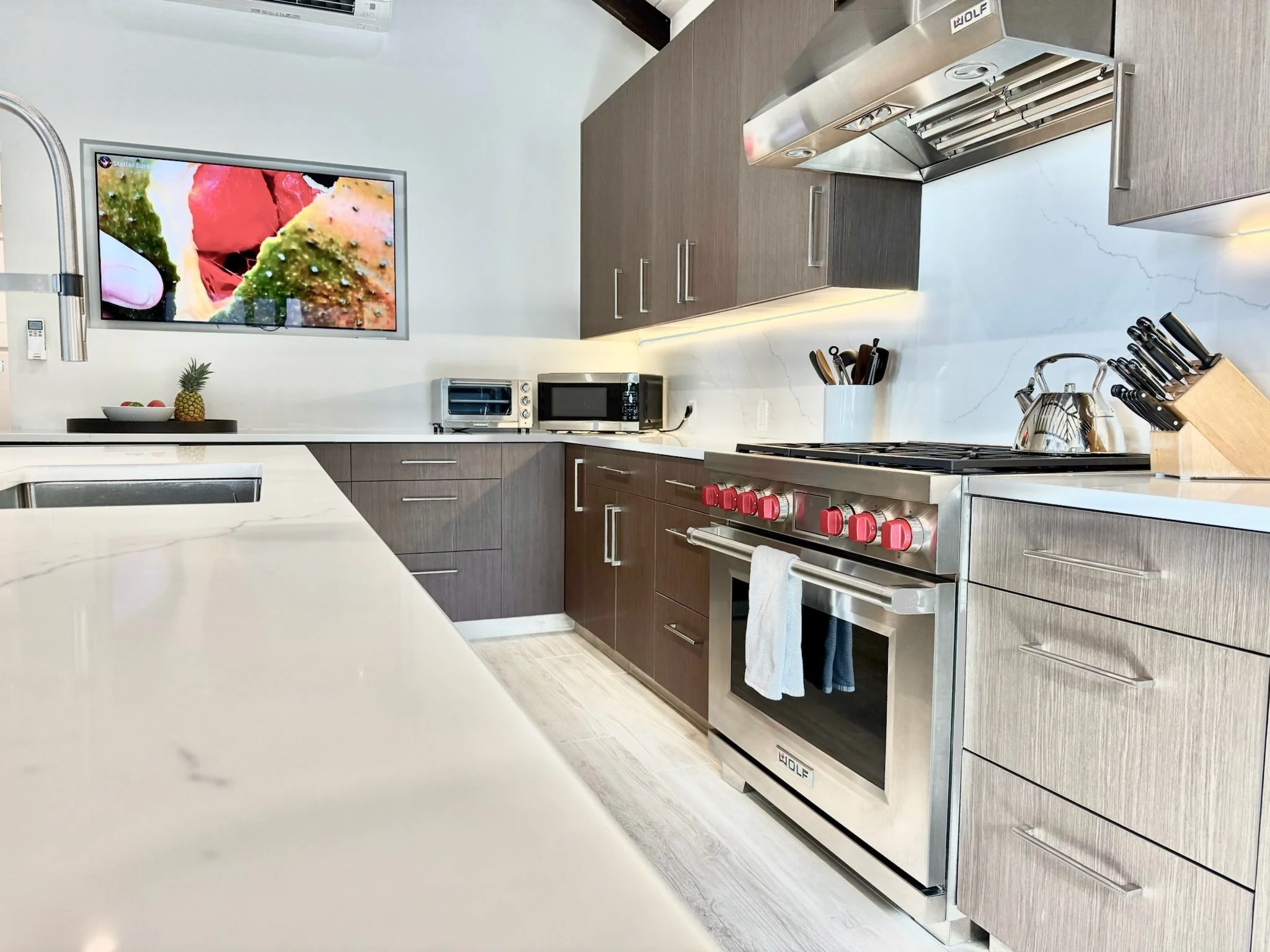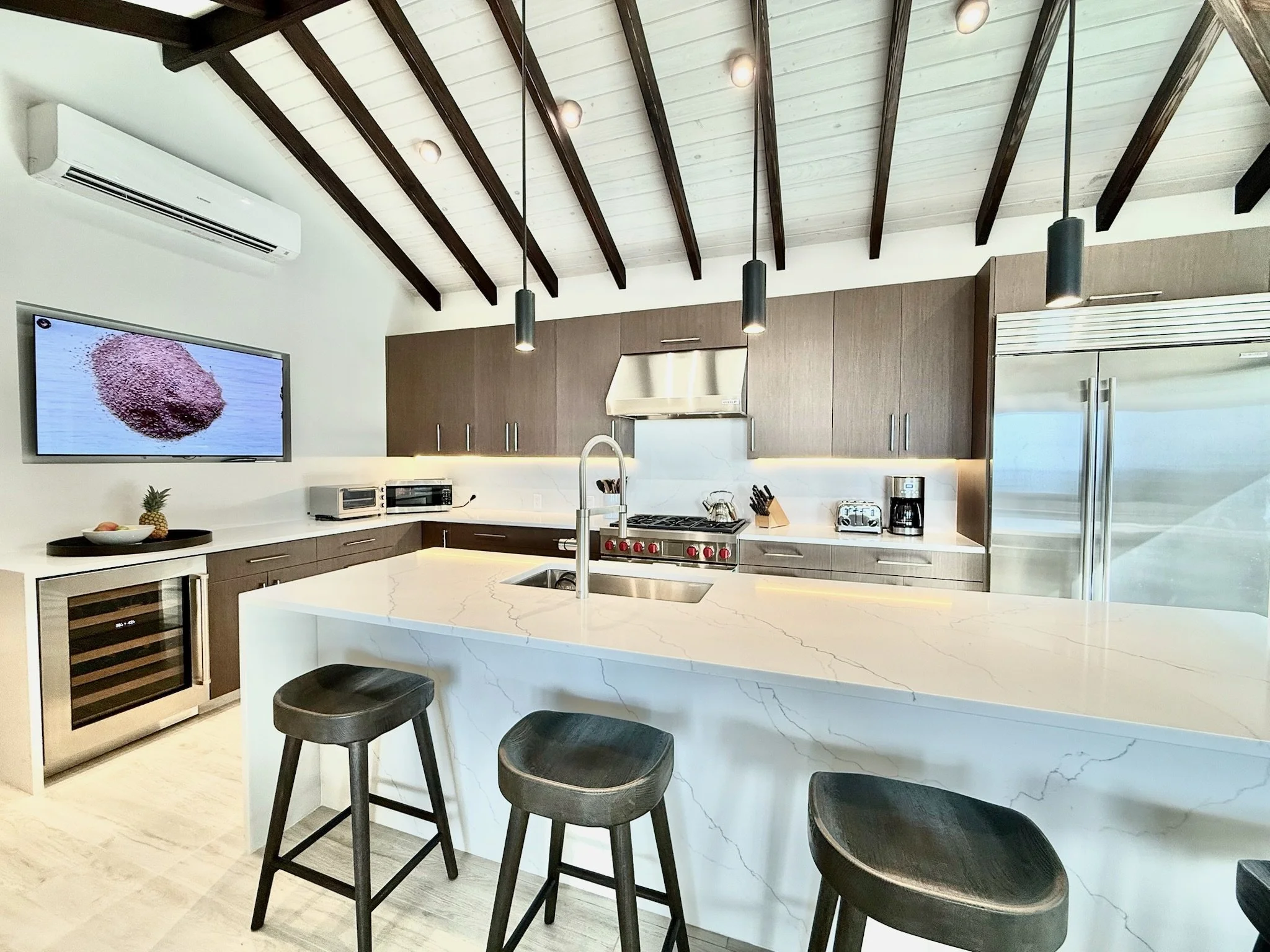 Three large primary bedrooms each with a king bed and en-suite bath are situated perfectly for privacy and quiet rest. The kitchen is a modern masterpiece, featuring a 36” Wolf range, a full-size Sub Zero fridge, an under-counter wine fridge and quality counter top appliances all under modern lighting. It is fully stocked to chef specifications and has a huge Wolf grill just outside the slider, designed for easy preparation of the best meals or to make your private chef event perfect.